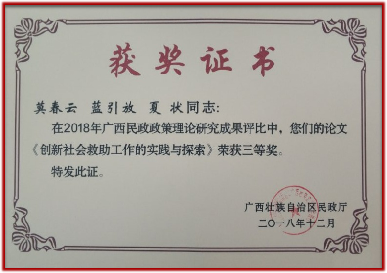 在2018年广西民政政策理论研究课题中,斯达咨询参与研究撰写的《创新社会救助工作的实践与探索》论文荣获2018年广西民政政策理论研究课题三等奖。该论文是由斯达咨询总经理夏状与柳江区民政局局长莫春云及柳江区福利院院长蓝引放共同研究撰写。