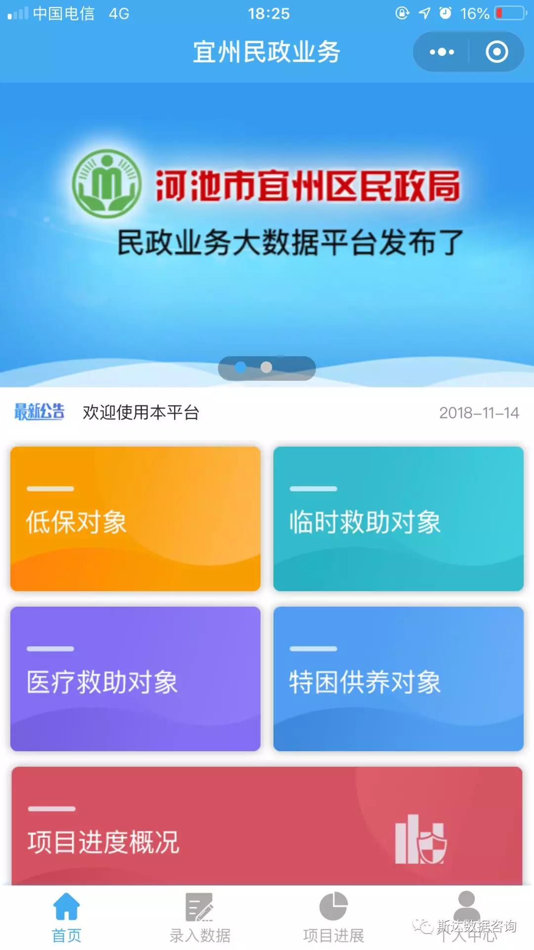 斯达咨询服务民政业务多年,在民政业务工作上不断探索创新,将民政业务与互联网相结合。斯达咨询在大数据及互联网+技术的推动下,积极引进数据可视化、云数据、云调查等多项高新科技型业务,在对宜州社会救助对象、城乡低保救助对象入户调查项目中,采用“民政小程序平台+纸质问卷”相结合的模式入户核查,根据小程序行动轨迹实时监督,让入户有迹可寻,实现核查透明化。