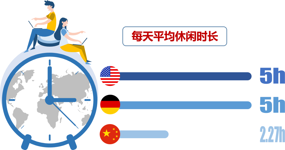 中国社科院一项调查显示,2017年中国人每天平均休闲时间仅为2.27小时。相比而言,美国、德国等国家国民每天平均休闲时间大约为5小时,是中国人的两倍以上。