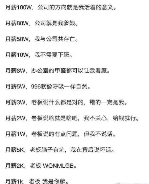 部分加班狗总会向钱看齐。在这部分人眼中,薪资、福利到位,996也是可以的。面对996,工资福利就是“亲爹”。然而,现实很残酷,没有多少老板能够满足员工工资上百万。