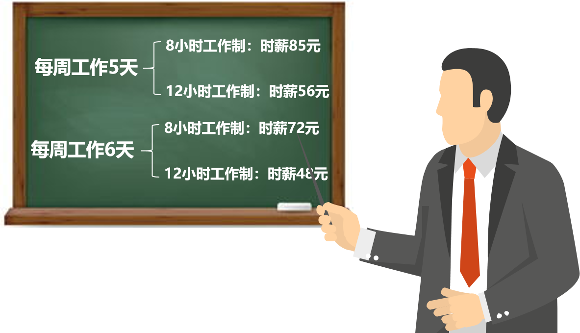 假设某月薪1.5万元的员工,按照22天工作制来说,按照8小时工作制,其时薪是85元;然而按照12小时工作制,其时薪为56元。如果每周工作6天,每月工作26天,“996”工作制下,其时薪就是48元,比正点下班员工的85元时薪少了近一半。