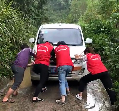 入户核查期间恰逢雨天,道路泥泞而狭窄,斯达人推着已坏的车子去维修,随后继续开展入户核查工作。