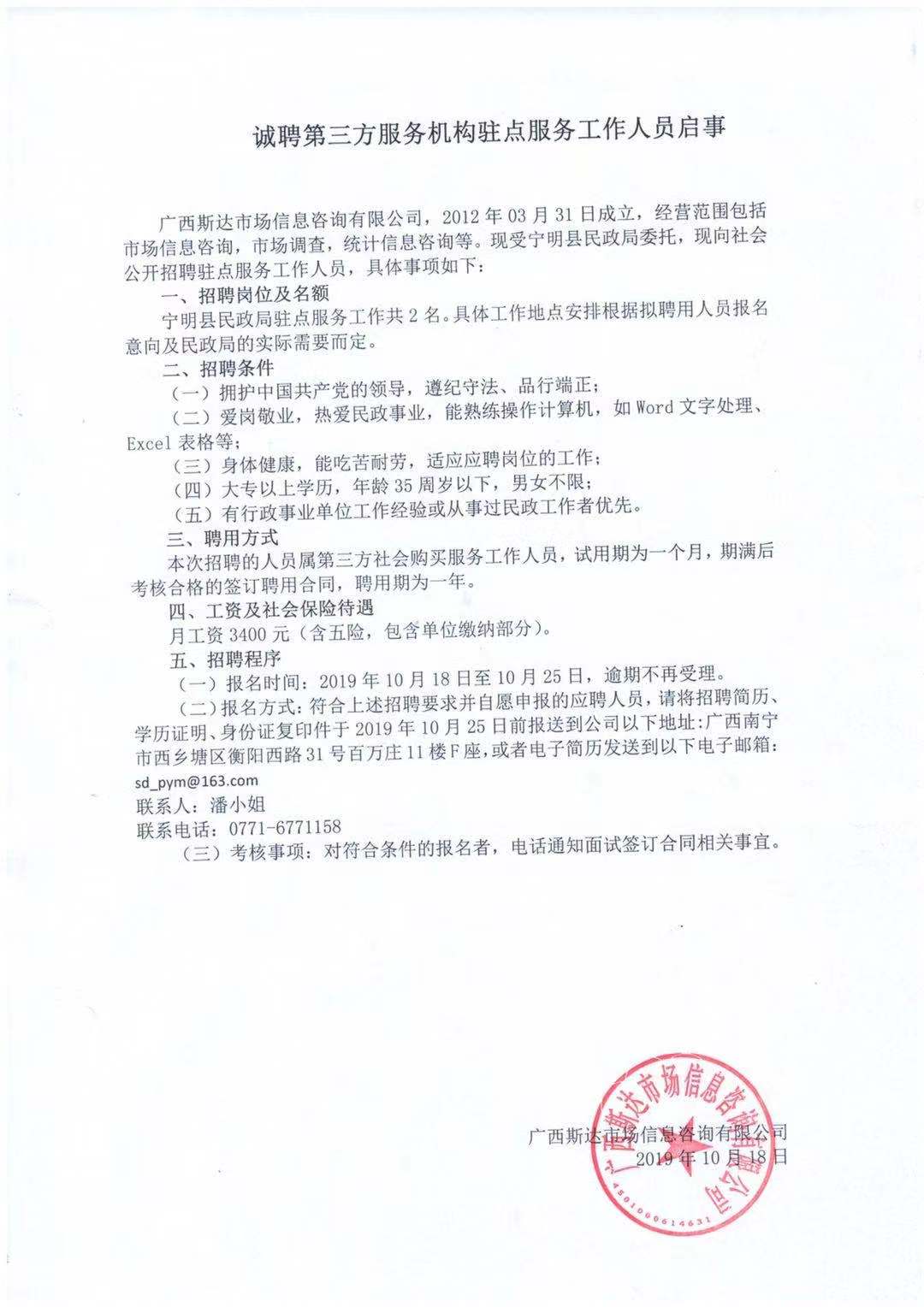 广西斯达市场信息咨询有限公司,2012年03月31日成立,经营范围包括市场信息咨询,市场调查,统计信息咨询等。现受宁明县民政局委托,现向社会公开招聘驻点服务工作人员,具体事项如下: