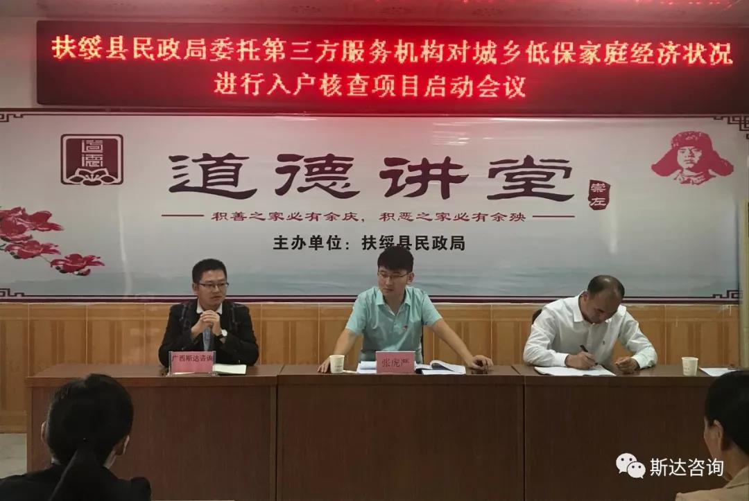 为客观、全面、深入地了解新增城乡低保、特困对象、低收入认定对象(含临时救助)、在享特困对象和低保扩面的经济状况和基层低保工作开展的实际情况,11月18日上午,扶绥县民政局委托第三方服务机构对城乡低保家庭经济状况进行入户核查项目正式启动,扶绥县副县长张虎严、县民政局局长吴日伟、县民政局副局长吴妙玲、各乡镇民政办主要负责人、斯达咨询副总经理夏雄和斯达咨询专项项目组人员参会。