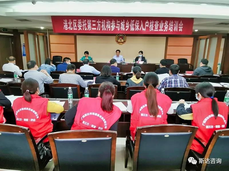 2020年4月17日,港北区委托第三方机构参与城乡低保核查工作业务培训会在港北区民政局召开,本次会议由港北区民政局书记潘建伟主持,港北区民政局核对中心主任王志英出席并做工作指示。港北区各乡镇、街道分管民政工作的领导,民政办主任,区民政局有关股室股长、主任、业务人员,斯达咨询民政事业3部总监周素群以及项目组成员参加了本次会议。
