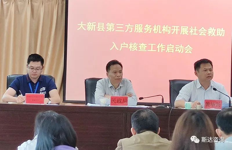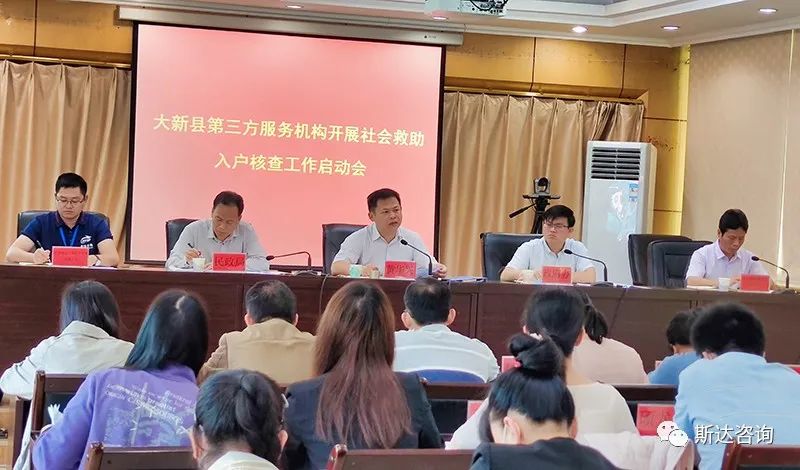 2020年4月29日上午,大新县第三方服务机构开展社会救助入户核查工作启动会议在大新县政府四楼会议室召开,本次会议由大新县县政府办副主任邓波主持,大新县副县长黄华兴,县纪委驻教育局纪检组组长,县民政局全体成员,相关股室负责人,各乡镇、大新华侨经济管理区分管领导、民政办主任,县民政局低保中心和核对中心全体工作人员,斯达咨询公司常务副总经理夏雄及项目组成员参加了本次会议。