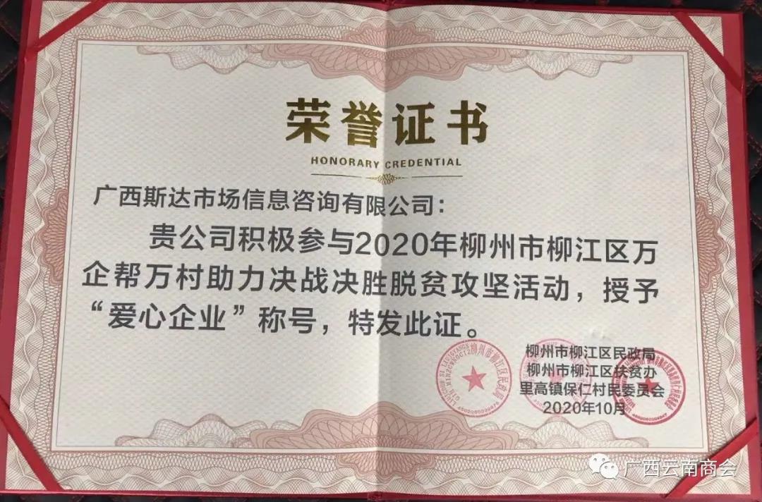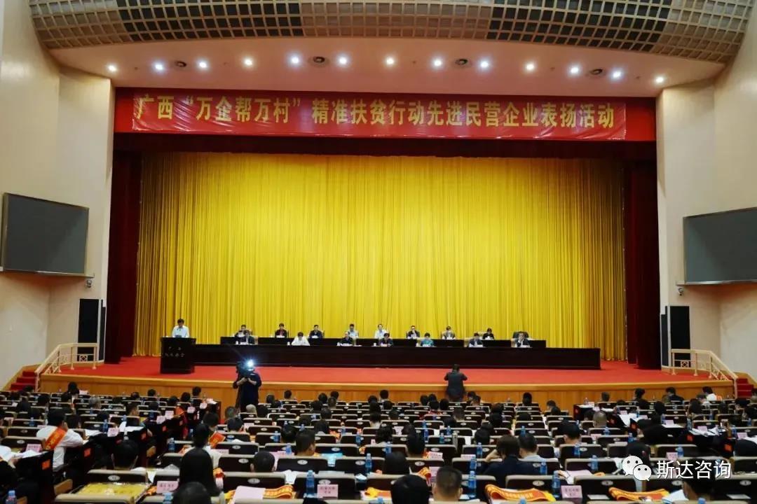 会上,自治区政协副主席、工商联主席磨长英发言表扬了踊跃参与精准扶贫行动、带动脱贫成效显著的优秀民营企业,广西斯达市场信息咨询有限公司在此次表彰活动中,荣获先进民营企业代表称号。