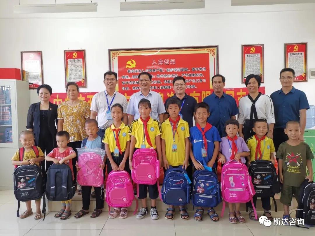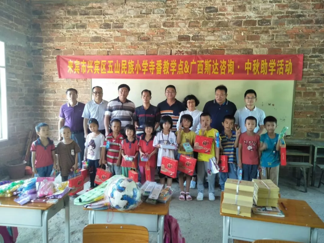 2018年9月中秋来临之际,斯达咨询总经理夏状及副总经理夏雄率慰问小组同来宾市副局长杨海峰、来宾市民政局核对中心主任来宾市民政局核对中心主任韦兰红,重大项目办公室彭耀生,兴宾区五山乡民族学校校长陆健及村干部共同到来宾市兴宾区五山民族学校寺番教学点慰问教学点的老师和孩子们。