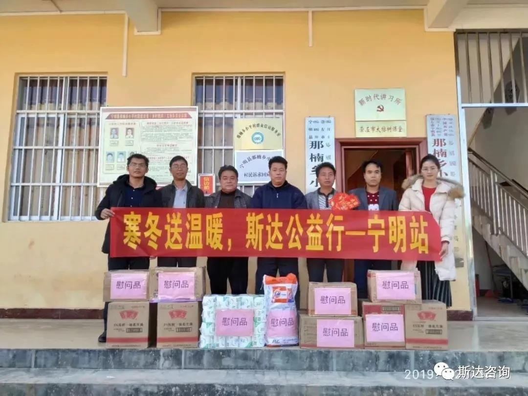 2019年11月,斯达咨询夏雄副总经理同崇左市宁明县民政局前往宁明县小平村“寒冬送温暖,斯达公益行”春节慰问活动,为贫困户送去棉被、花生油、牛奶等慰问物资。