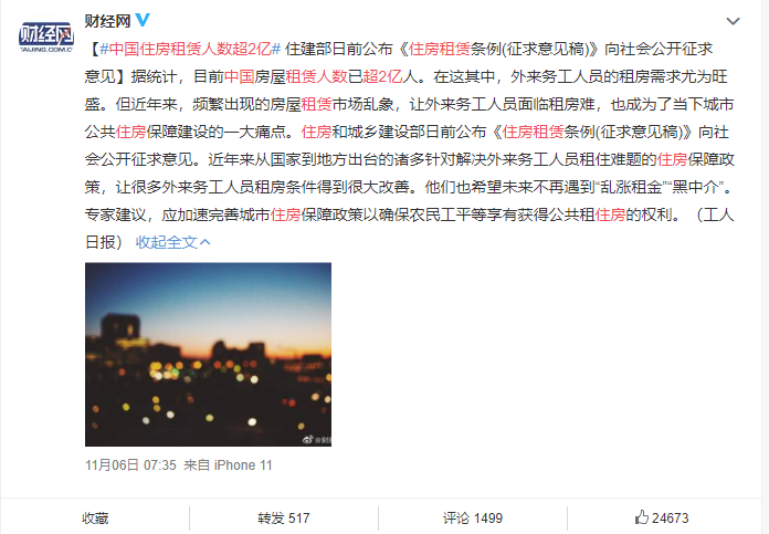 近日,一条“中国住房租赁人数超2亿”的新闻冲上了微博热搜榜,该新闻阅读量近300万,备受广大网友关注。在第七次人口普查的数据尚未公布前,若按照之前国内14亿人口计算的话,相当于每7个人中就有1个是租房子住。