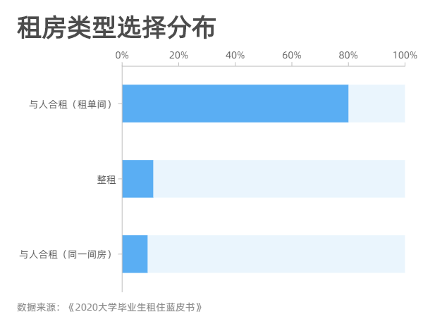 在租赁方式为整租的房子中,3室及4室的占比最大。我们从《2020大学毕业生租住蓝皮书》中拿到了一组数据,有近9成的大学毕业生在租房时选择合租。虽然只是针对大学毕业生的数据,不能代表年轻人群体,但其还是有一定的参考性。