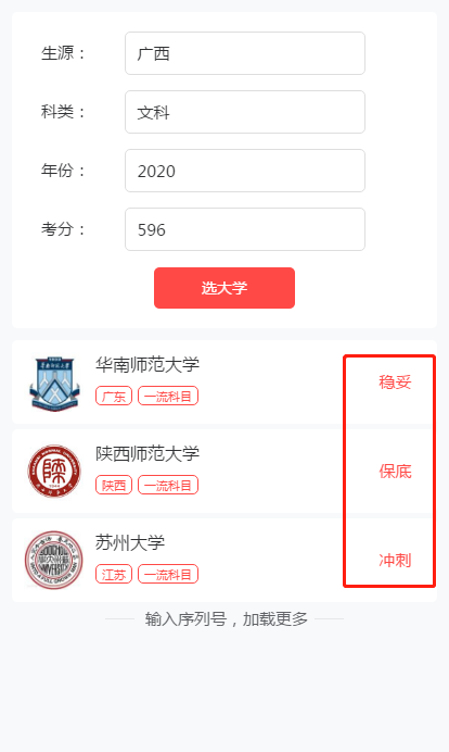 一键为考生挑选出与考分匹配的招生院校,并将结果院校进行“稳妥、保底、冲刺”的多梯度划分,让考生在选大学时更加高效和精准。