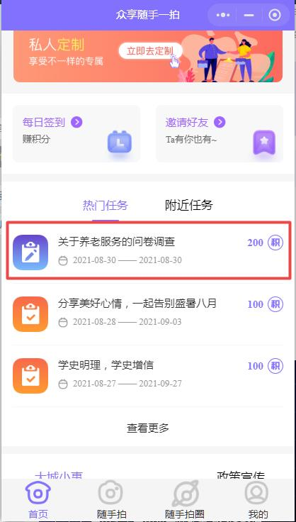 您扫描“众享随手一拍”二维码,寻找到“关于养老服务调查”的任务,即可参与。