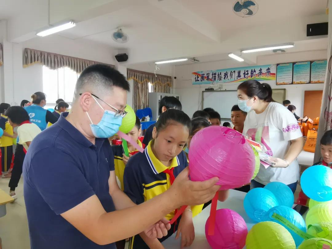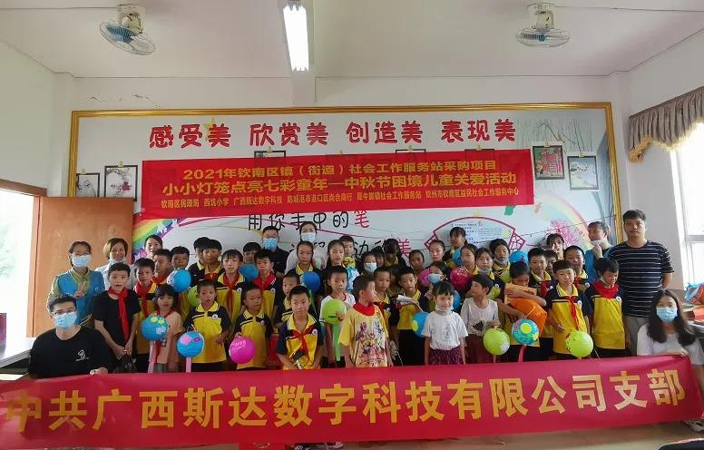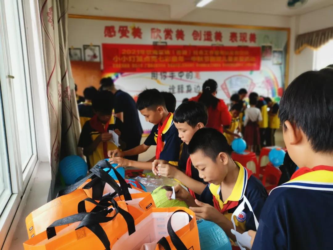 2021年9月17日上午,广西斯达数字科技有限公司常务副总夏雄、防城港市港口区尚合商行总经理黄霞以爱心志愿者的身份带着物资来到西坑村和孩子们一起参加“小小灯笼点亮七彩童年”活动。