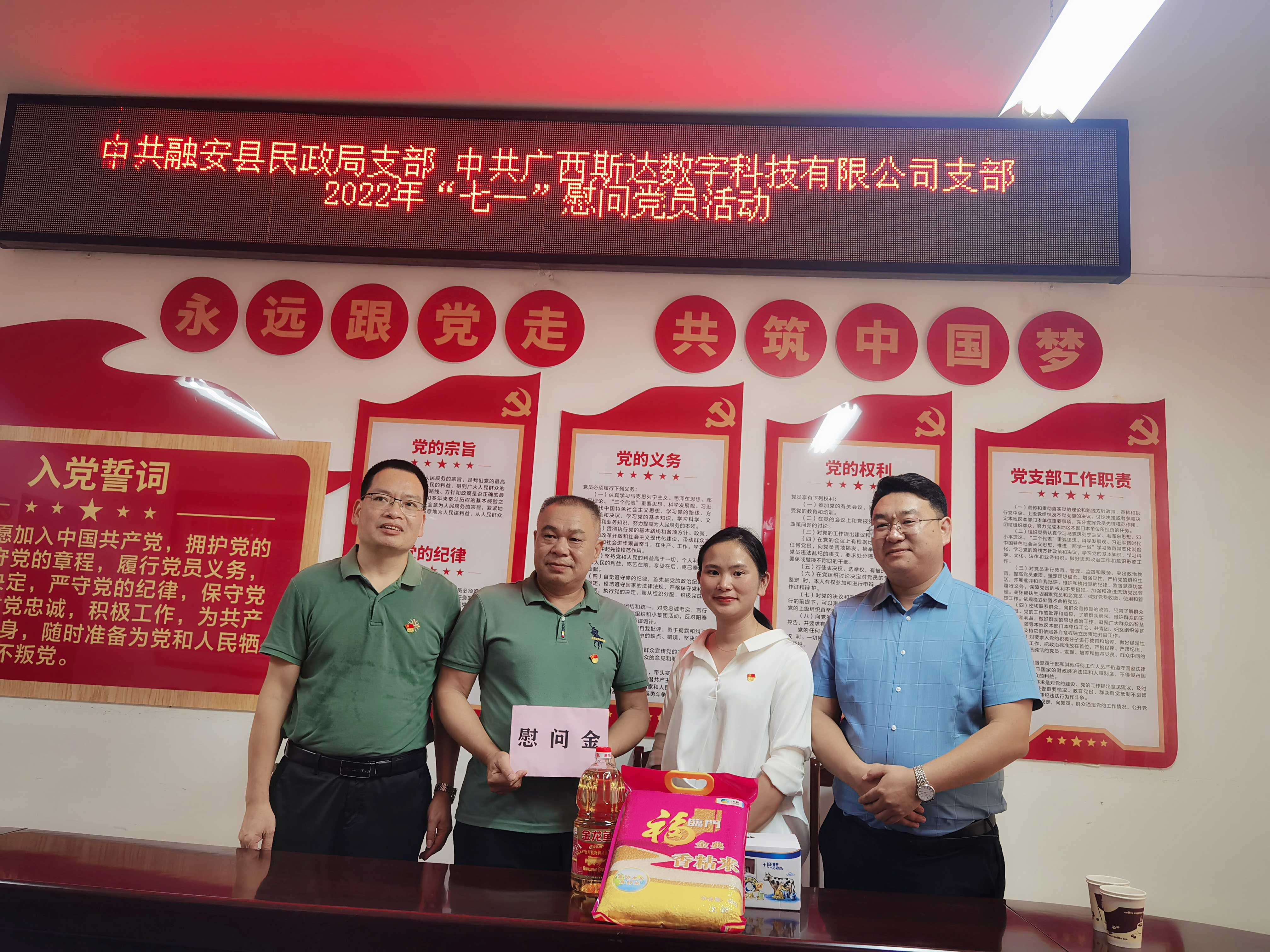 2022年7月1日,为庆祝中国共产党成立101周年,广西斯达数字科技有限公司和柳州市融安县民政局共同举办了“关爱老党员”慰问活动。