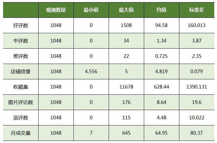本研究共获得1048家店铺的数据,数据包括好评数、中评数、差评数、店铺信誉、收藏量、图片评论数、追评数和月成交量,各变量的描述性统计分析如下表所示。