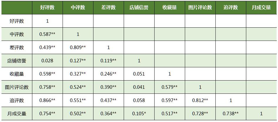 从上表中可看出,好评数、中评数、差评数、图片评论数、追评数和收藏量的最小值均为0,各个变量的均值符合人们日常消费的习惯。消费者给出好评的次数要比中评和差评的次数多,中评无论在最大值还是均值上,都比差评高,这也符合消费者的行为,在购买商品的过程中,若不存在问题,消费者是极少给出差评的,且卖家会对给差评的买家进行沟通,提高自家店铺的好评率。在店铺信誉上,由于描述、服务、物流三者的评分相差不大,且消费者对三者的评分偏向于给予满分5星,因此店铺信誉的均值为4.819,接近5星。由图片评论数和追评数看出,消费者给这两种评价的次数偏少,而进行收藏行为的人较多。