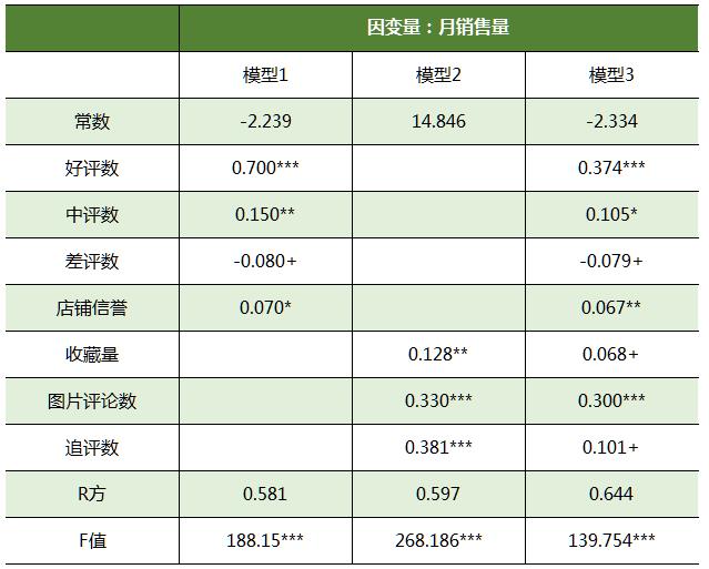 在模型1中,主要变量对月销量的回归系数均在10%统计水平下显著。在模型2,附加变量对月销量的回归系数均在0.1%统计水平下显著。在模型3中,所有变量对月销量的回归系数均显著。回归结果显示,好评数、中评数和店铺信誉均对商品销量有显著的正向影响,差评数对商品销量有显著的负向影响。收藏量、图片评论数和追评数均对商品销量有显著的正向影响。