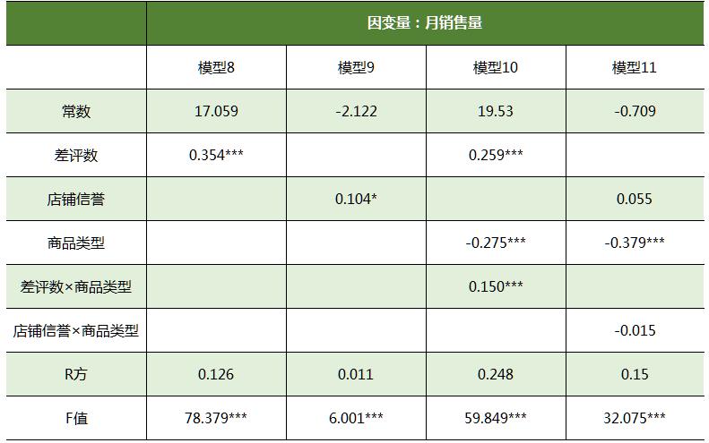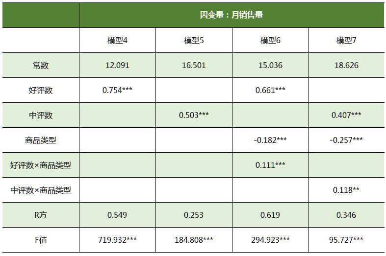 模型4、模型5、模型8和模型9是主要变量的基本模型,模型6、模型7、模型10和模型11分别加入调节变量“商品类型”,交互项“好评数×商品类型”、“中评数×商品类型”、“差评数×商品类型”和“店铺信誉×商品类型”。从结果可以看出,除模型11中的交互项未通过显著性检验外,其他交互项均通过了显著性检验,模型6显示商品类型对好评数和商品销量关系存在显著的调节作用,模型7显示商品类型对中评数和商品销量关系存在显著的调节作用,模型10显示商品类型对差评数和商品销量关系存在显著的调节作用。综上,主要变量和商品销量存在显著的相关关系,商品类型对好评数、中评数、差评数和商品销量间存在显著的调节作用,商品类型对店铺信誉和商品销量不存在显著的调节作用。