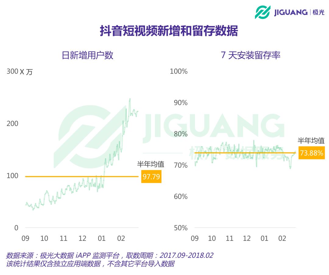 抖音短视频在日新增用户数上也实现了明显的增长。在过去半年内,抖音短视频的日新增用户数均值为97.79万。在7天安装留存率上,抖音短视频的表现则相对比较稳定。抖音的7天留存率半年均值为73.88%,证明超七成用户在尝鲜期过后仍愿意在设备上保留应用。