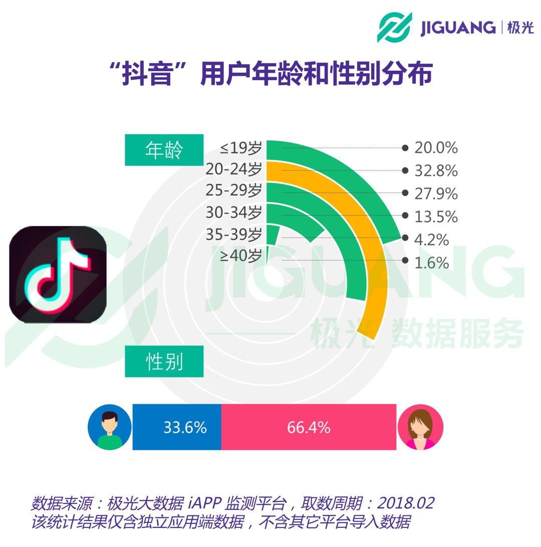 根据极光大数据的统计结果,抖音短视频中女性用户的占比要显著高于男性,达到66.4%。尽管用户体量日益壮大,年轻用户在抖音短视频中仍旧占据着较大的比重,19岁以下的用户占比为20%,24岁以下为52.8%。