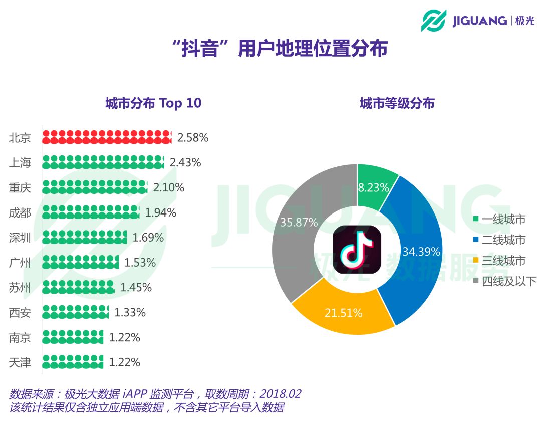 抖音用户对具体城市并没有表现出显著的集中度,即便是在用户分布上占比最高的北京,所占的比例也仅为2.58%。尽管最初的定位更偏向于一二线城市的年轻用户,但随着用户规模逐步扩大,抖音向三线及以下城市的下沉也愈发显著。用户城市等级分布结果显示,分布在三线城市的抖音用户占比为21.51%,四线及以下城市更是达到35.87%。