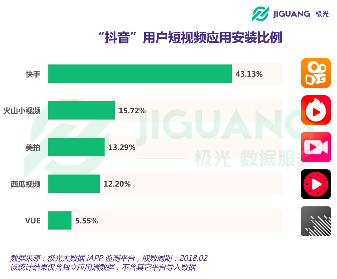 应用重合度数据显示,截至今年2月份,在抖音用户中渗透率最高的同类应用是快手,有43.13%的抖音用户同时在设备上安装有快手应用端。同属今日头条旗下的火山小视频在抖音用户中也有着较高的渗透率,达到15.72%,而美图公司旗下的美拍则为13.29%。