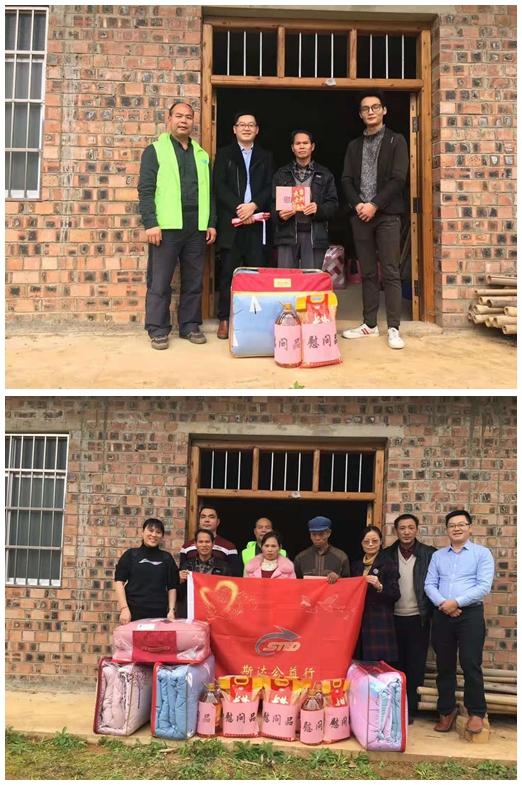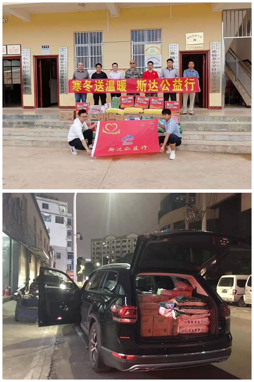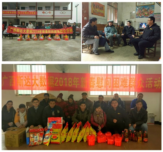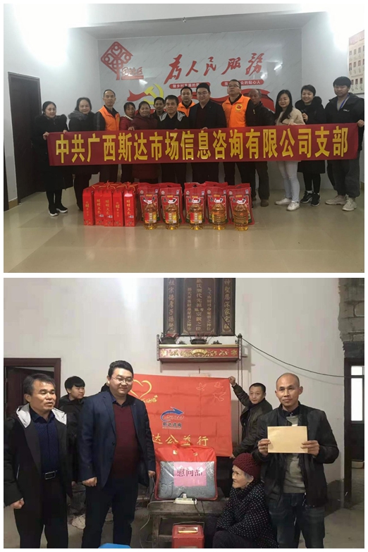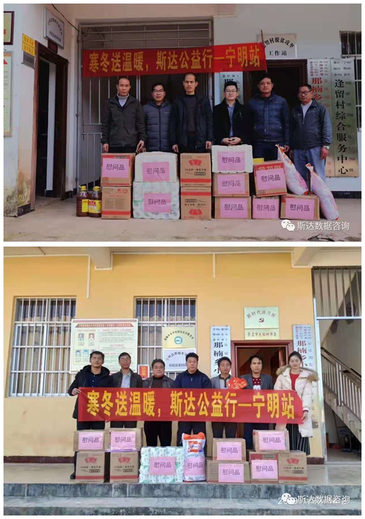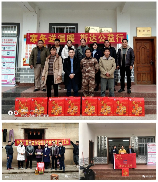 由斯达数字科技公司的总经理夏状先生率公司支部慰问小组同宜州区民政局党组书记韦庆祝在河池市宜州区福龙乡弄丁村和象州县大乐镇龙屯村开展了“寒冬送温暖,斯达公益行”的新春慰问活动,捐赠对象26户。