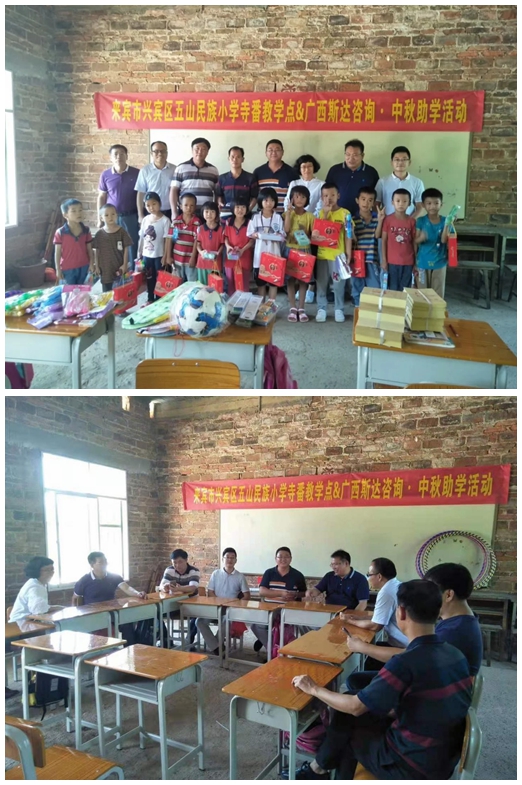 斯达数字科技总经理夏状先生率慰问小组同来宾市兴宾区教育局副局长杨海峰、来宾市民政局核对中心主任来宾市民政局核对中心主任韦兰红,重大项目办公室彭耀生,兴宾区五山乡民族学校校长陆健及村干部共同到来宾市兴宾区五山民族学校寺番教学点慰问教学点的老师和孩子们,覆盖学生18人。